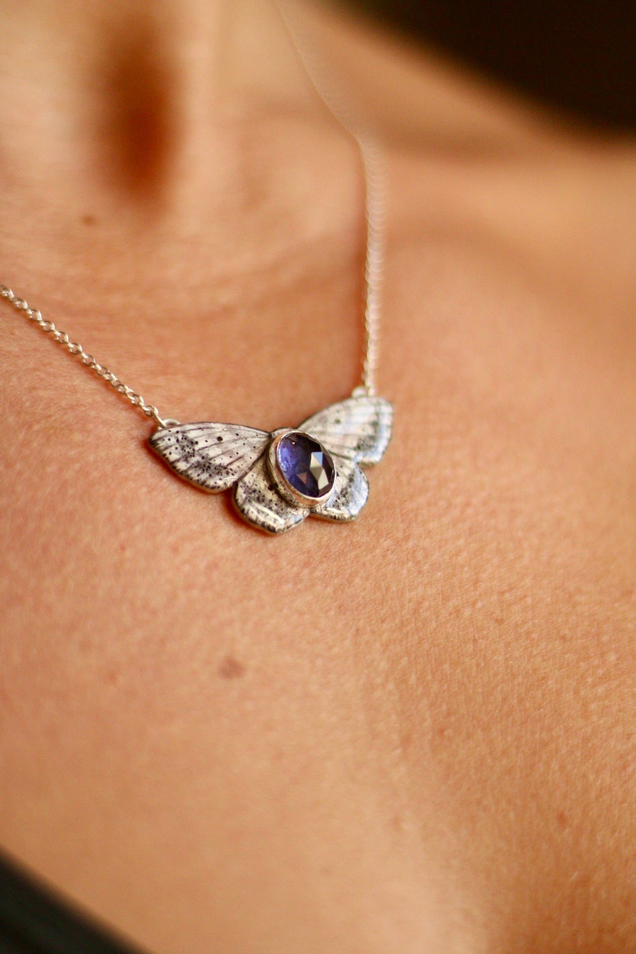 This moth pendant features an ethically sourced Iolite stone and is enameled by hand. Made from silver with a sterling silver chain.